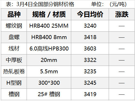 3月4日,钢材现货市场持稳,期货市场主要品种主力以涨为主,其中螺纹涨0.13%、热卷持平、铁矿涨0.4%,焦炭涨0.66%,焦煤跌0.23%。重要会议召开,下游限产情况下,需求释放受限,期钢无力突破,明日人大会议将开幕,两会影响有待显现,明日钢价......