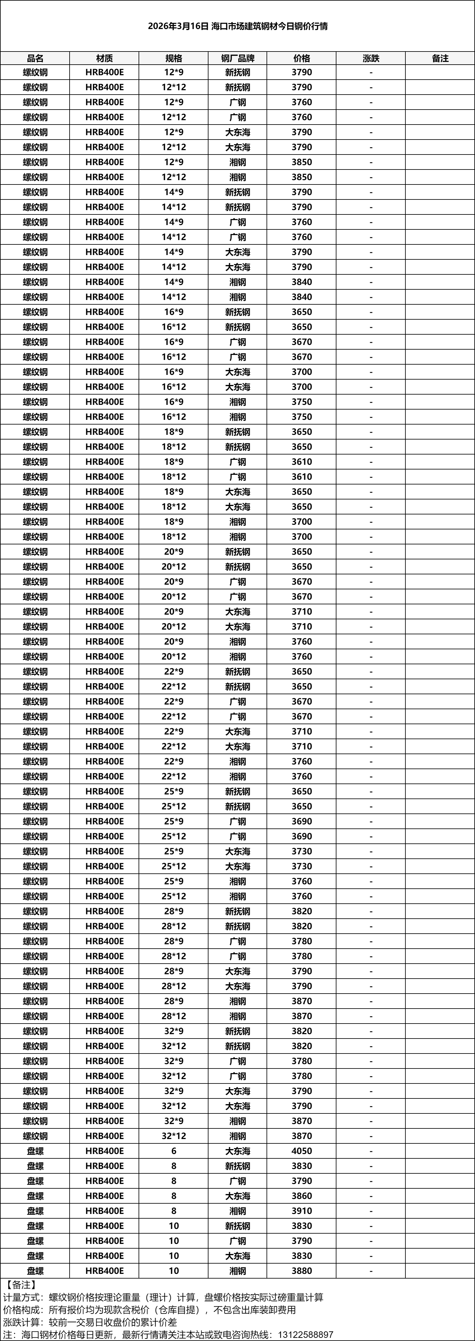 2026年3月16日 海口市场建筑钢材今日钢价行情