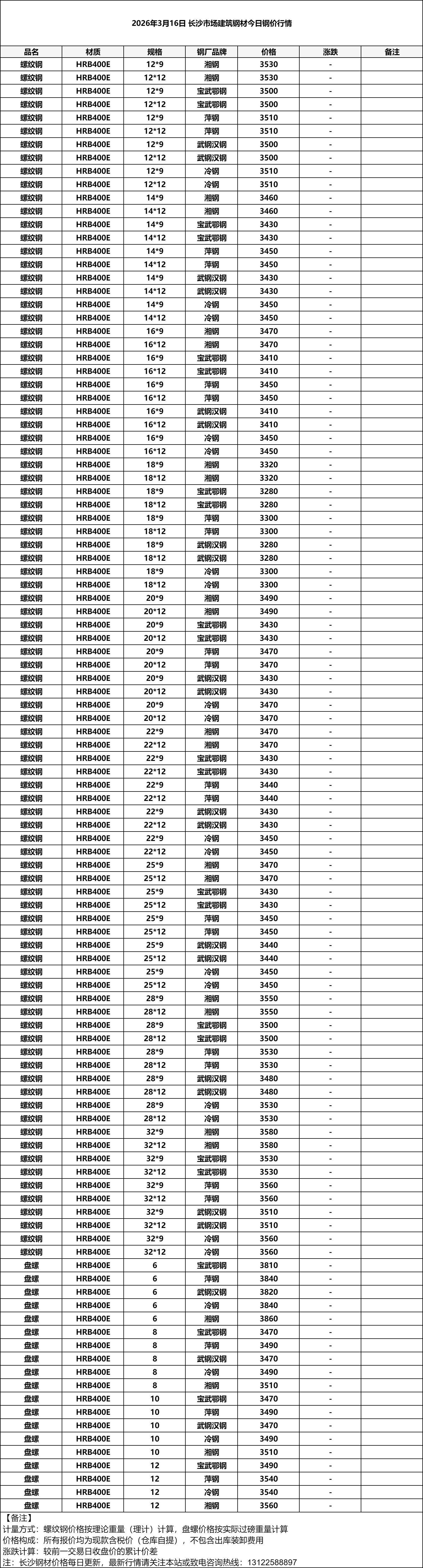 2026年3月16日 长沙市场建筑钢材今日钢价行情
